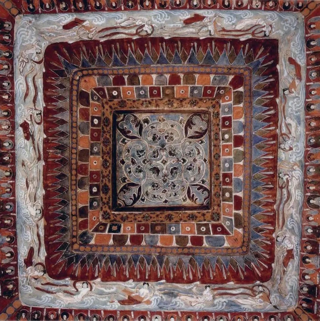 首先从洞窟整体布局来看,敦煌壁画确实严格遵循了对称法则。一般说来,主要是以洞窟西壁为中心,南、北两壁相向的壁画之面积、位置等呈对称均衡状。同时敦煌壁画中的图案最具有对称特征,如西魏第285窟南壁“五百强盗成佛图”中建筑屋顶上的斗鸡图;隋代第292窟人字披西披龛下的双狮忍冬图案;隋代第277窟西壁龛口的联珠纹边饰;西魏第285窟、北周第299窟、隋代第402窟的龛楣图案和北魏第257窟的平棋图案、西魏第288窟的人字披图案等等,都具有对称的美学特征。
