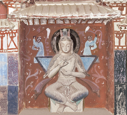 图中交脚菩萨为中心构筑的这幅画面,土红色沉稳,蓝色迷蒙,阙形龛围护着这个小世界,北凉人所要托付的、所要救赎的都通过颜色有所表达。