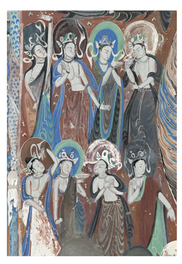 敦煌艺术灿烂辉煌,其壁画艺术蔚为大观,在中国绘画艺术史上占有极其重要的地位。它融古汇今,汲取了东西方影响,包纳了巨大容量,创造了独特形象,从而成为中国乃至世界艺术史上的奇葩。敦煌壁画艺术蕴含着“崇高与优雅、对称与和谐、阴柔与阳刚、悲壮与英勇、庄严与浪漫”的显著美学风格。