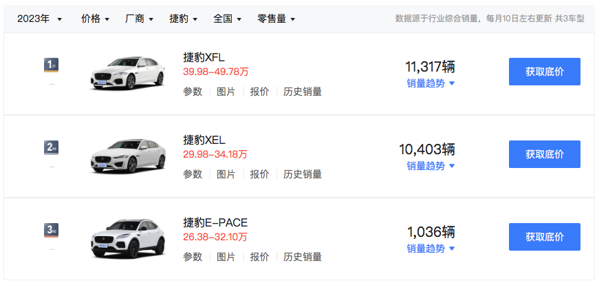 数据显示,2017年捷豹路虎在中国市场累计销量14.64万辆,同比增长23%,成为捷豹路虎全球最大汽车销售市场。不过从2017年开始起销量开始下滑,2018年-2021年销量分别为6.8万辆、5.3万辆、5.8万辆、5.4万辆。而到了2023年已是另外一番景象。零售数据显示,2023年全年,捷豹销量为2.28万辆,细分车型中,捷豹XFL和捷豹XEL销量分别为1.13万辆和1.04万辆,而捷豹E-PACE仅为1036辆。