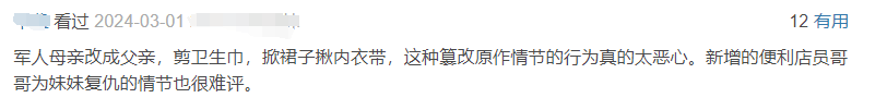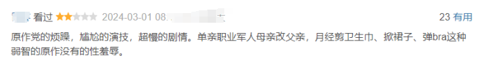 作为一名没有看过原漫的观众,单冲原作粉丝提到的原作单亲妈妈被篡改成父亲这点,我真觉得这部剧是在改编雷区蹦迪了。