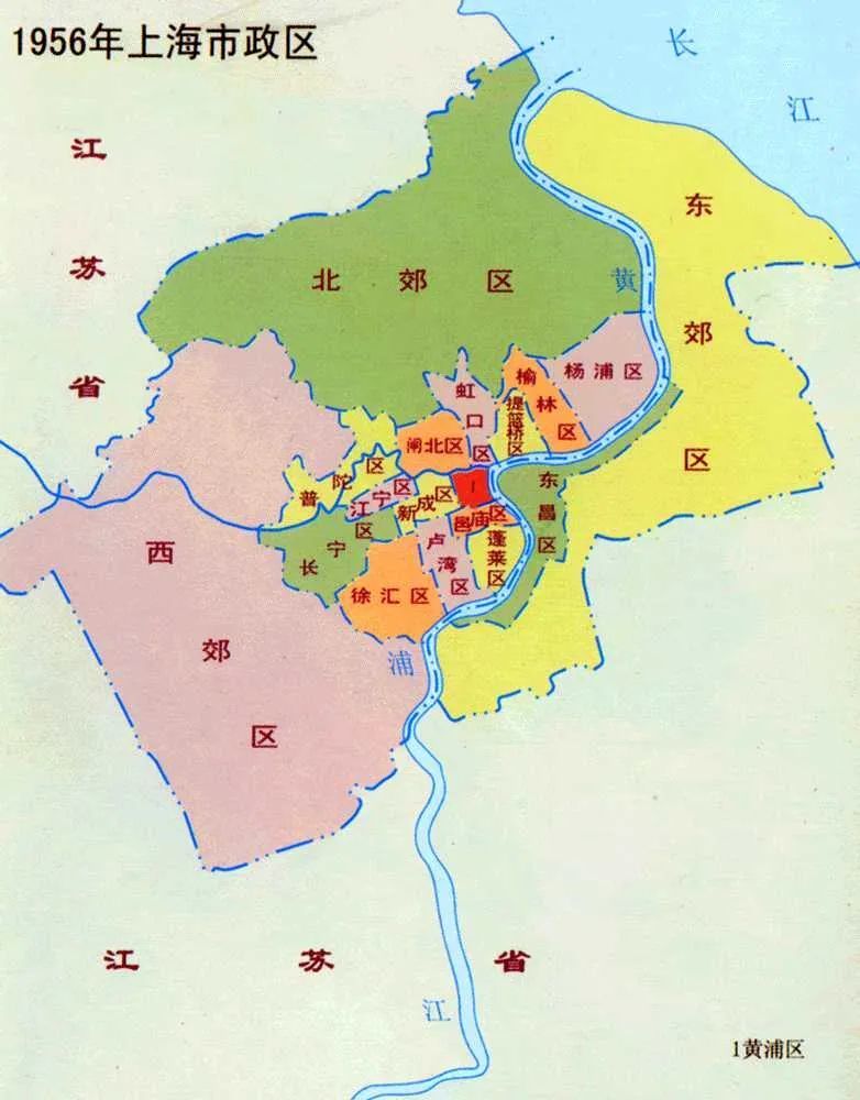 1958年,上海从江苏并入多个县,面积增长十倍有余达到6340平方千米,也就是今天上海的区划范围。