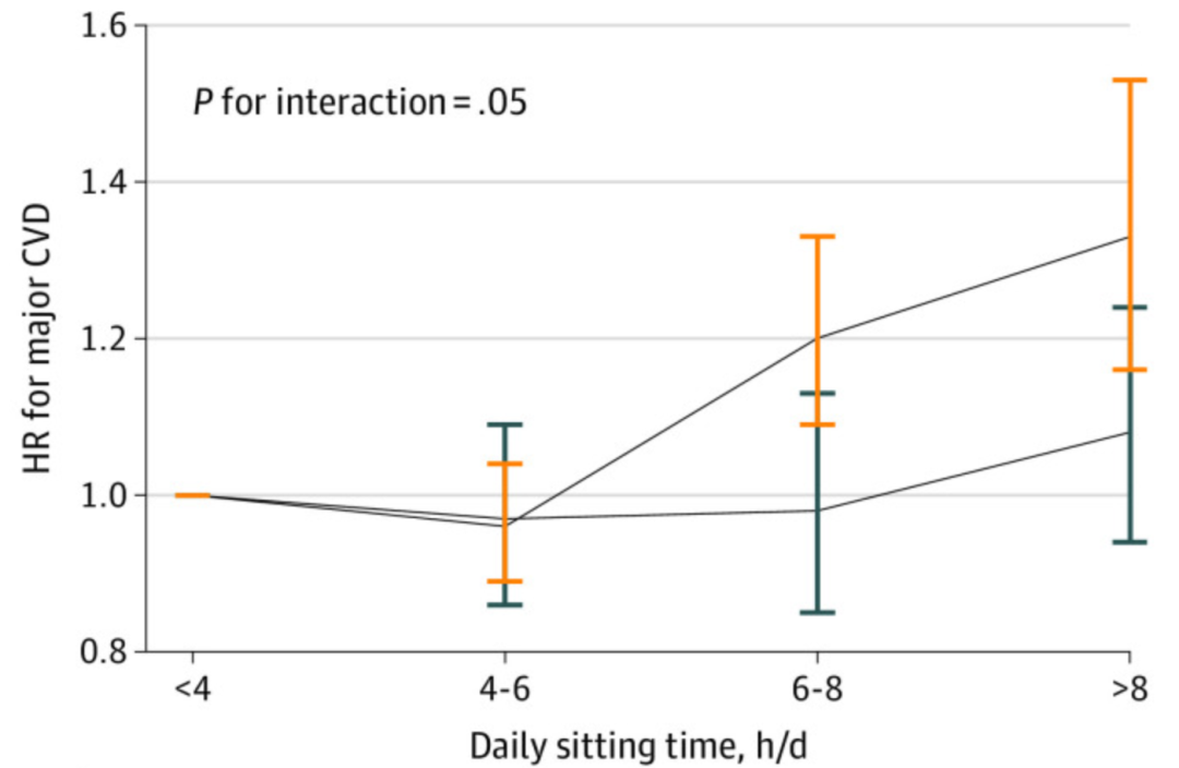 主要心血管疾病(CVD)风险比(HR)与每日坐着时间的比较|图源:参考资料[4]