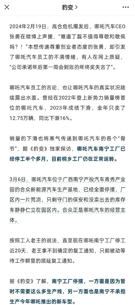 有员工表示,哪吒南宁工厂停工近20天,老王拿不到确定的复工通知,只能被动等待工作群里的顺延复工通知。据《豹变》了解,南宁工厂停摆,一方面是因为暂时不需要这么多生产线,另一方面也是南宁不承担生产今年哪吒推出的新车型。