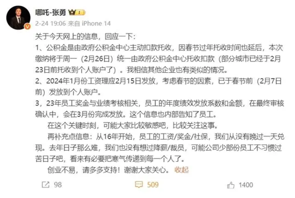 此前,有关哪吒汽车推迟年终奖发放一事在网上引发热议,哪吒汽车张勇回应称:“员工的年度绩效发放系数和金额,在最终审核确认中,会在3月份完成发放。”他同事还说道:“从2016年开始,员工的工资/奖金/社保,我们从没有晚过一天兑现。去年日子那么难,我们也没有想过降薪/裁员,可能公司少部分员工不习惯过苦日子吧,看来有必要把寒气传递到每一个人了。”