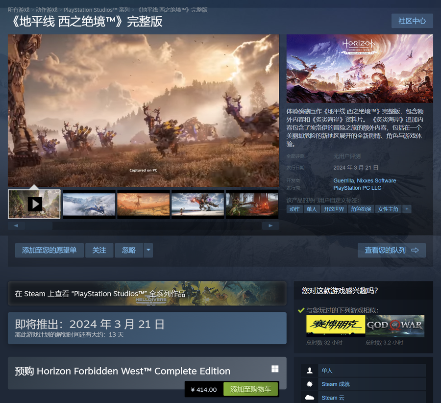 今年PC游戏热门大作之一的《地平线:西之绝境》完整版将于3月21日正式发售,目前Steam平台预售价414元,价格不算便宜。该游戏支持NVIDIA DLSS 3、Reflex和DLAA,此外还支持AMD FSR和Intel XeSS。总的来看,这款游戏对NVIDIA、AMD、Intel三家显卡均比较友好。