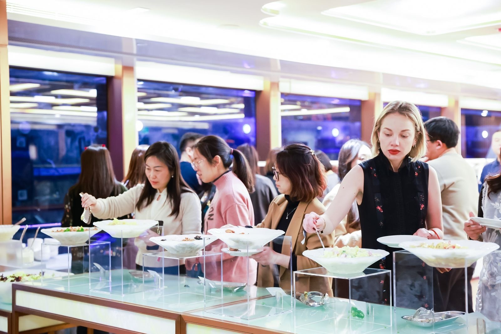 登船后,一场海派文化之旅正式拉开帷幕,游船一层的餐桌上摆满了美食,让人忍不住直流口水,本次微醺派对2.0中,上海浦江游览集团有限公司和北外滩国客中心为市民游客们准备了地道而又有腔调的老上海本帮特色美食,现场精致的30多道本帮盛宴畅吃,还有石库门锦绣年华、Whisky特调畅饮,搭配提前布置好的用餐氛围,让人无不陶醉其中。