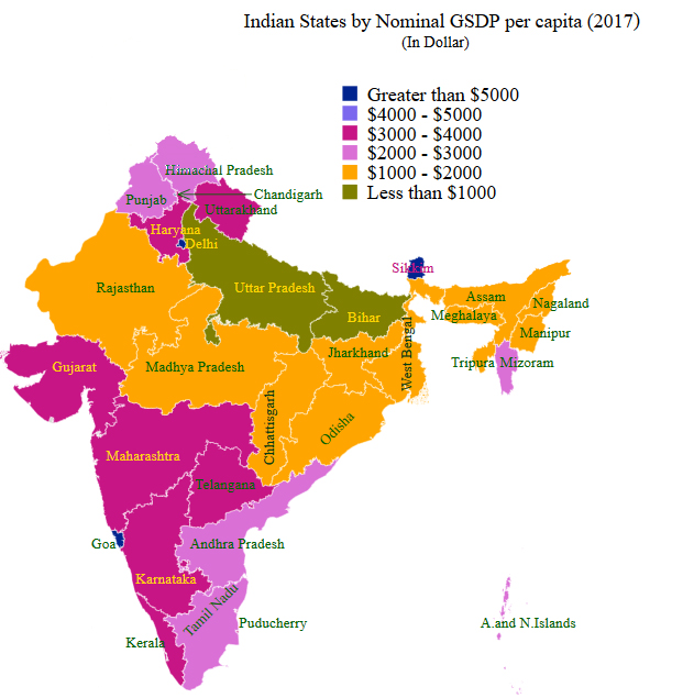 ▲印度各地人均GDP(单位:美元)地图,南方明显比北方高
