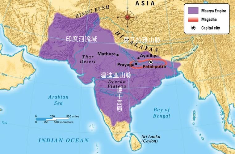 ▲紫色区域为孔雀王朝领域,温迪亚山脉为南北线