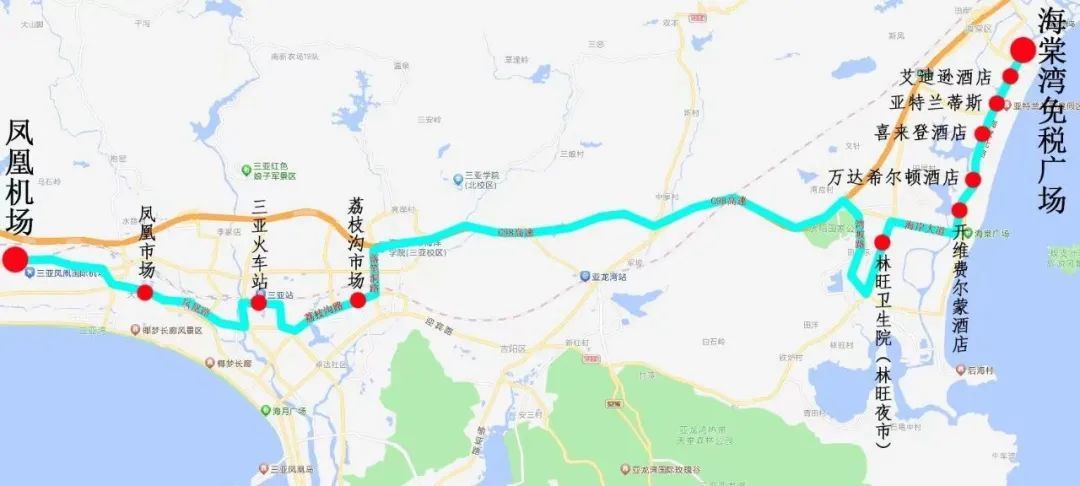 据悉,该专线的起讫点为三亚凤凰机场至海棠湾免税广场,停靠点分别为凤凰机场、凤凰市场、三亚火车站、荔枝沟市场、林旺卫生院(林旺夜市)、开维费尔蒙酒店、万达希尔顿酒店、喜来登酒店、亚特兰蒂斯、艾迪逊酒店、海棠湾免税广场。