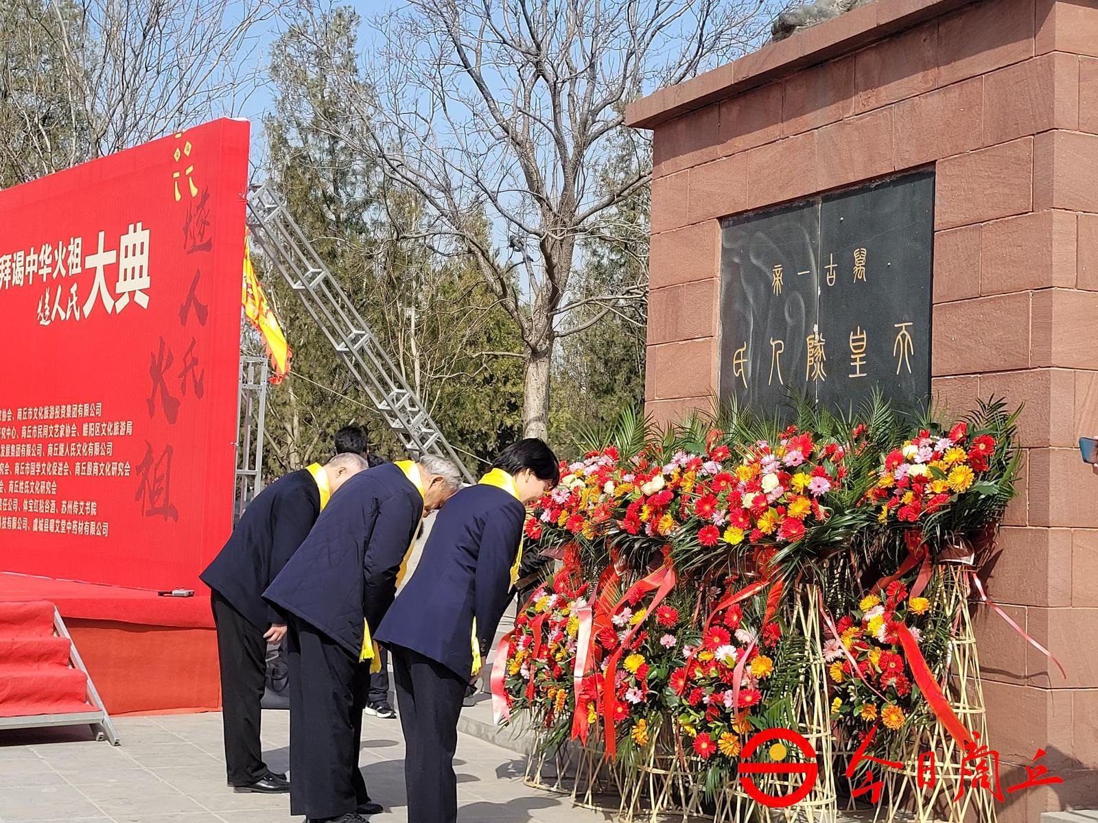 敬献花篮。出席公祭大典的领导和嘉宾,缓缓步入,向中华火祖燧人氏敬献花篮,手留余香,敬仰中华民族原始祖先。缅怀燧人氏的历史功德、弘扬中华优秀传统文化是华夏共同心愿。