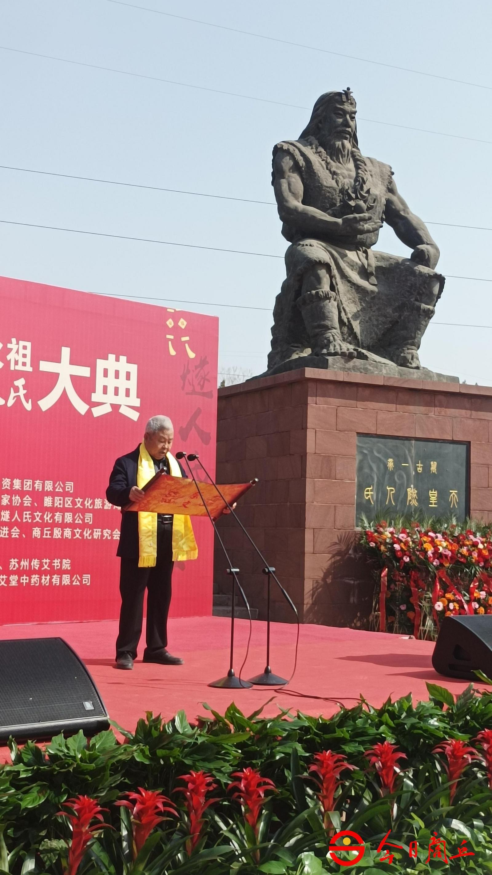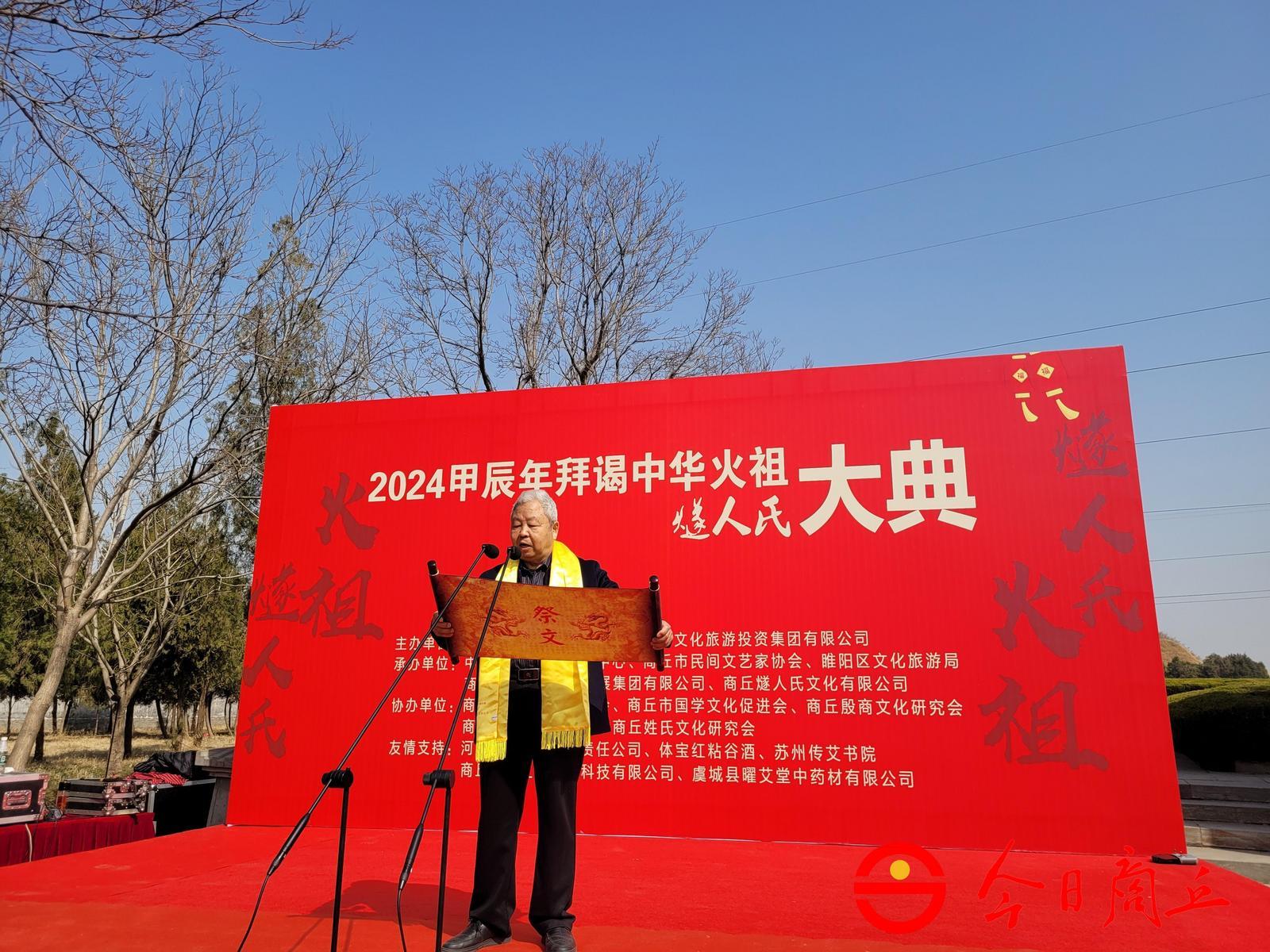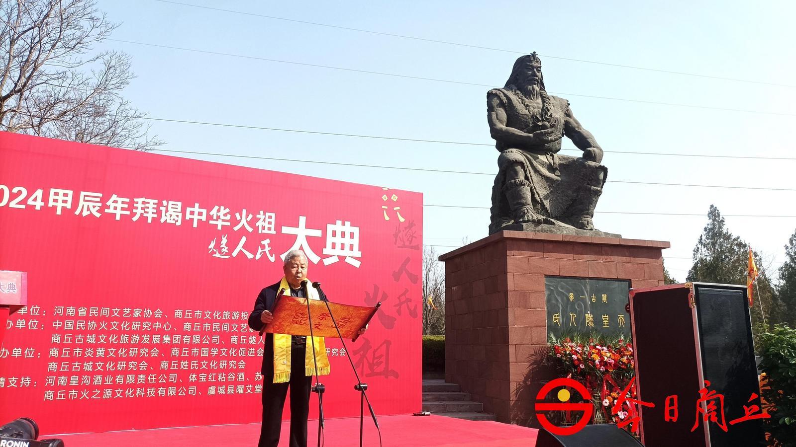 “泱泱华夏,历史悠长。远古之世,天地苍茫。昼夜不分,蒙昧洪荒。民饮生食,肠胃疾伤。人文始祖,共尊天皇。钻木取火,文明开创……”商丘市姓氏文化研究会会长田启礼恭读祭文,追思火祖燧人氏钻木取火、开创华夏文明先河的伟大功绩,歌颂新时代社会各领域取得的辉煌成就,祈佑中华文明万世永续、伟大祖国繁荣昌盛、各族人民幸福安康!