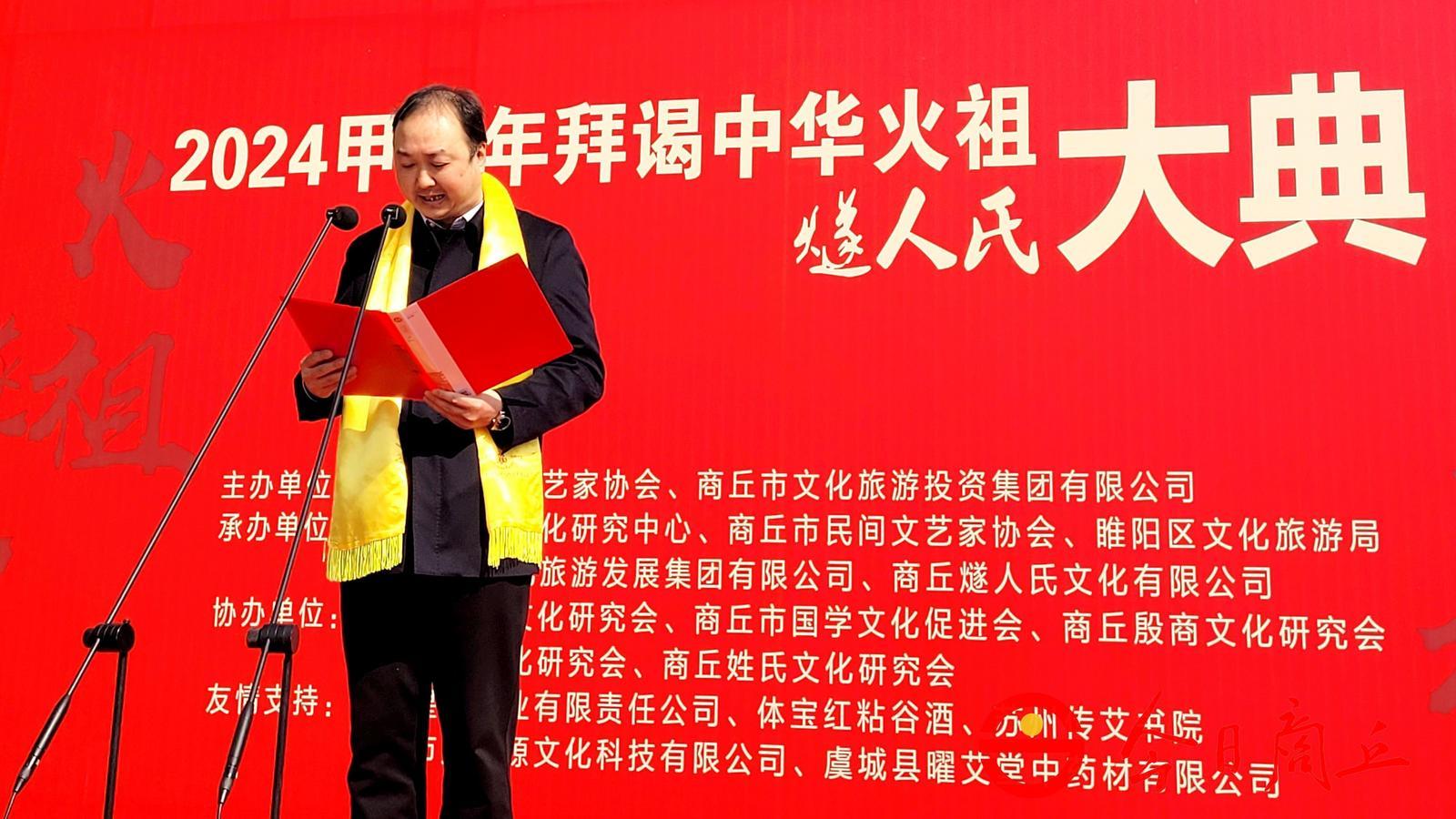 10时许,河南省民间文艺家协会主席彭恒礼致辞后,宣布2024甲辰年拜谒中华火祖燧人氏大典开始。