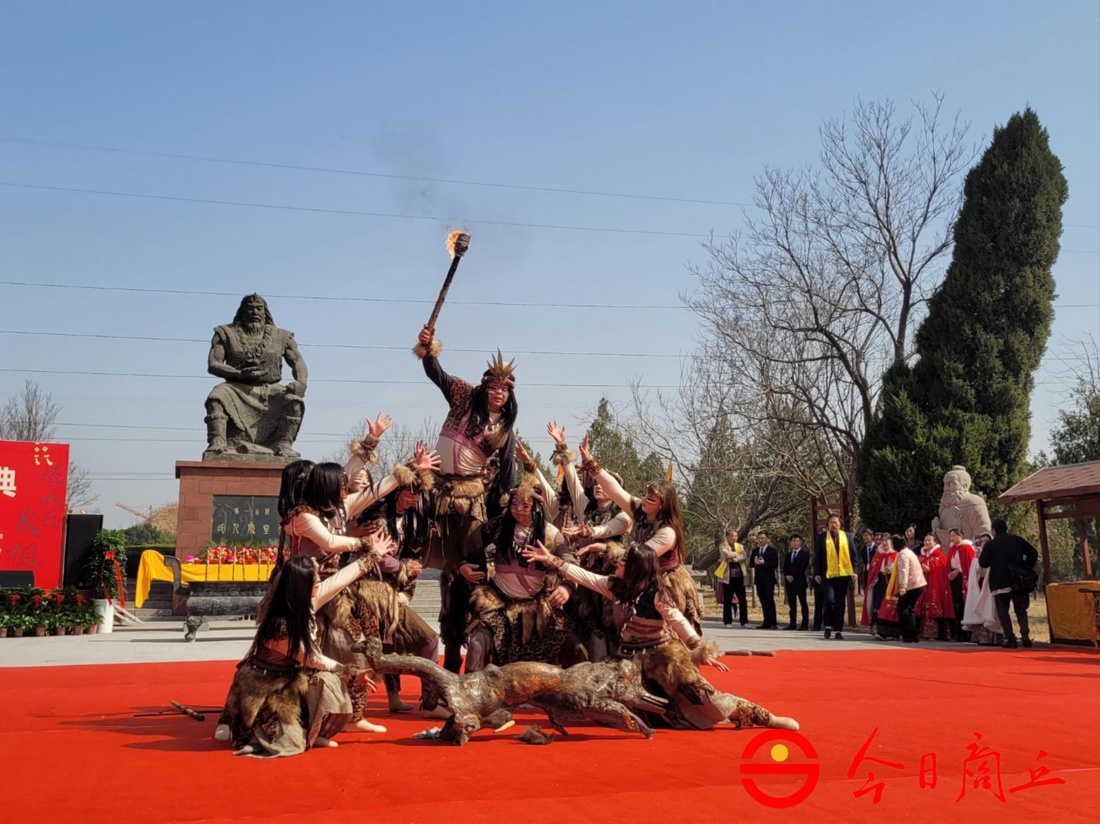 恭读祭文毕,商丘古城文旅集团演艺团队演员身着远古服饰进行表演,再现燧人氏钻木取火历史情景。