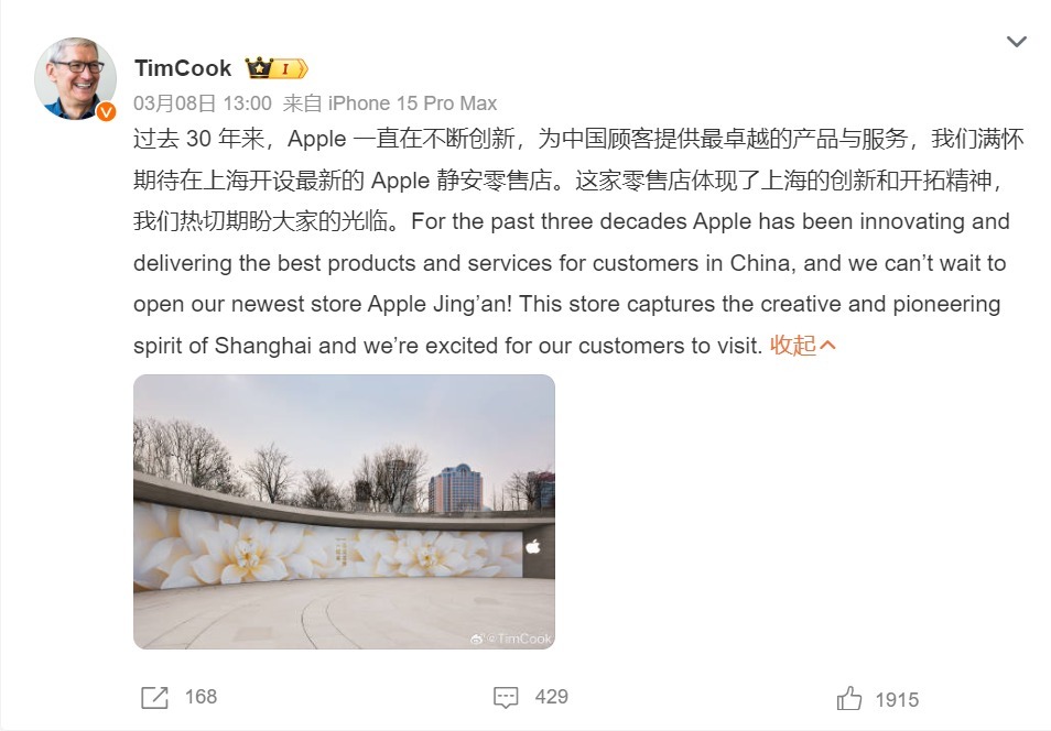 苹果公司首席执行官Tim Cook近日在微博上发表动态,表达了对新店的期待,强调这家零售店捕捉了上海的创新和开拓精神,苹果公司热切期盼顾客的光临。