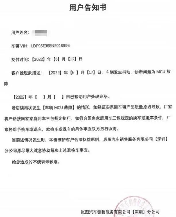 而有着同样问题的车主并不只这一位,一位济南的网友购买的岚图FREE车型仅仅行驶一个月就出现动力缺失、方向丢失、行驶中车辆“趴窝”情况。事后,该车主认为这个问题,符合新三包法规免费退换车标准,故提出退车诉求,却被岚图汽车销售网点的工作人员拒绝退车。
