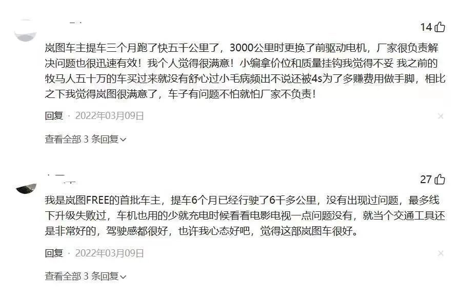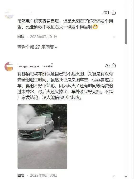而在这些问题下方小编也看到了不少给岚图洗白的评论留言。而这些账号的统一口径都是说自己是岚图的车主,甚至起火了说到比亚迪不敢每一辆起火都发通告。不得不说;1、岚图销量和比亚迪比,还真的没法保证每辆起火的比亚迪都会得到曝光。2、只要是社会舆论的起火事件,厂家都会发通告。这不禁让人产生疑问,岚图的网上车主,比真实车主多?一个月卖不出几台,哪来的那么多车主?