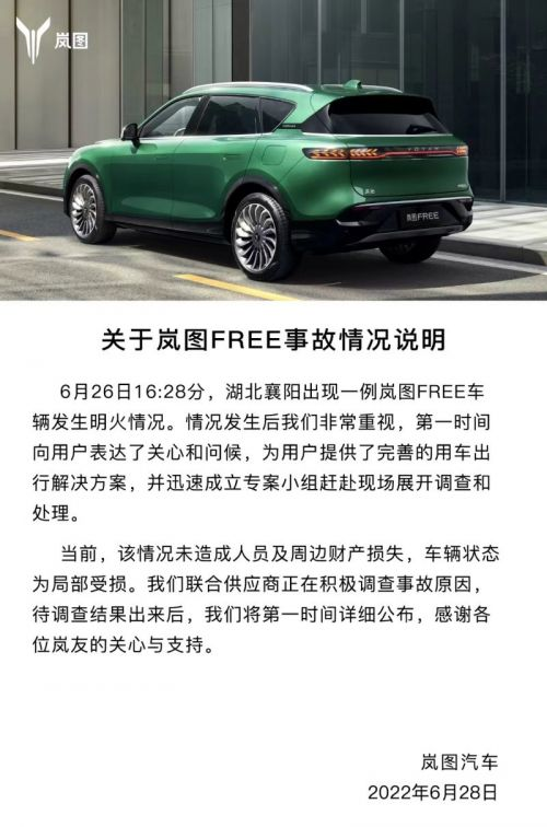 此外就在岚图FREE上市一周年之时,在湖北突发了自燃事件,这对品牌安全来说无疑影响不小。从现场情况来看,起火车辆位于充电桩前,车底有明火喷出,同时伴有大量浓烟。