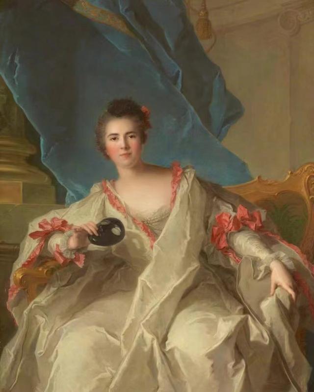 宫廷画师的一个重要职责是为贵族女性画像,他们往往构造出一个个刻意营造的“舞台”式背景,比如纳蒂埃在侯爵夫人身后悬挂的大幅帷布,戏剧效果就相当精彩。王宫贵妇们为彰显身份必华服加身,于是大多画像三分之二的画面留给了服装和背景。