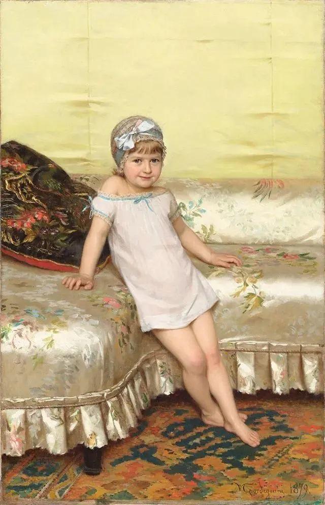 经过张扬浮华的布歇和帕特,与力求朴实的雷诺兹和格勒兹之后,戈尔迪贾尼描绘的细腻光滑的丝绸也许是法国学院派沙龙肖像画的最后亮点,重要的是《丝绸沙发》中小女孩的神情发生了微妙的变化,她的天真中多了一丝从容。