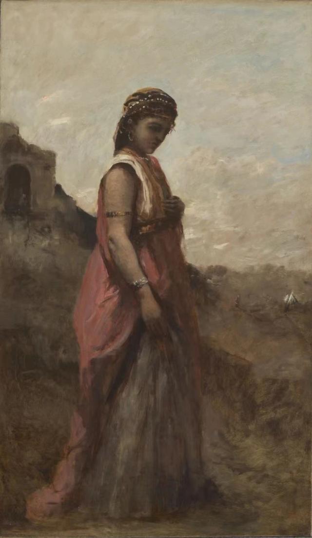 300多年间,佛兰德斯、荷兰和法国的画家们不由自主地经历了风格上从样式主义到巴洛克、洛可可再到新古典主义的清晰演变,女神们的面貌总体差别不大,直到19世纪下半叶柯罗的《朱迪斯》成为转捩点。犹太巾帼英雄朱迪斯不再身处于我们所熟知的如真蒂莱斯基的血腥场面,而是一位乡村少女伫立在田野间,她左手放在胸前,右手挽裙裾,露出的右胳膊上戴着两个银环,似暗示其手刃亚述统帅赫罗弗尼斯的雄心和魄力。她眼望地面,心事重重,或许正经历潜入敌营前的踌躇,这一刻是那么宁静,其实却惊心动魄。画作中银灰的天空、褐色的田园与红色的裙装弥漫着光影,充满诗意。