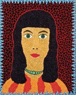 然而半个世纪后,凯蒂·拉·罗卡在回应乌菲齐自画像的邀约时取消了面容,只是将自己头骨的X射线图与手的照片的复合图像上写下数个“你”,草间弥生则睁大眼睛直视观者,将人们拖入她的圆点漩涡。为了对抗男性的凝视,女性展开自我否定,女神化为乌有,贵妇被砍了头。当美貌消失,性感无存,当女性的容颜崩坏、坍塌,她们的身体是否就获得了解放?所叩问的自我就得以表达?而女画家们渴求的自由是否也因此实现了呢?