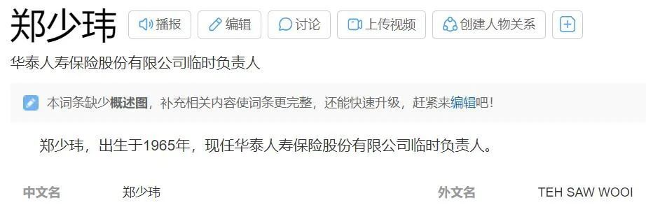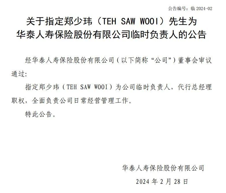 华泰人寿官网日前公告称,友邦人寿江苏分公司原总经理郑少玮出任华泰人寿临时负责人,代行总经理职权。