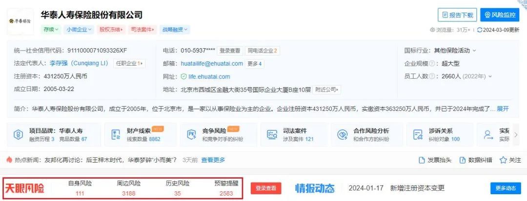 天眼查平台信息显示,华泰人寿周边风险高达3000余项。从诉讼情况来看,2021年以来,华泰人寿作为被告,所牵涉的案件也在明显增长。