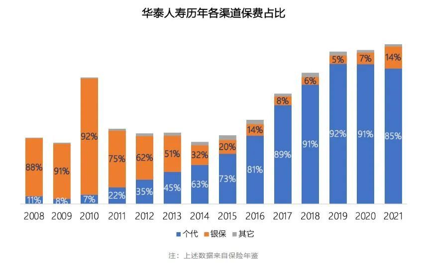 同年华泰人寿调整战略,个险渠道开始全面铺开,经过几年调整,在2014年,其个险渠道保费占比首次超过银保渠道,至此个险渠道业务成为业务重心。