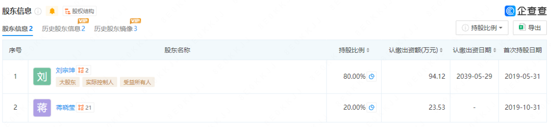 股东信息显示,公司由由刘宗坤、蒋晓莹分别持股80%、20%。值得一提的是,蒋晓莹是香飘飘创始人蒋建琪的独生女,目前任香飘飘食品股份有限公司董事。