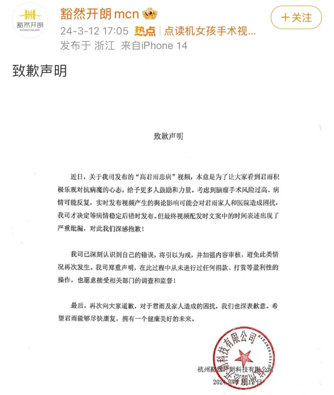 公司在发布“高君雨患病”等视频上,“文案中的时间表述出现严重纰漏”,还郑重声明“在此过程中从未进行过任何捐款、打赏等盈利性的操作”。