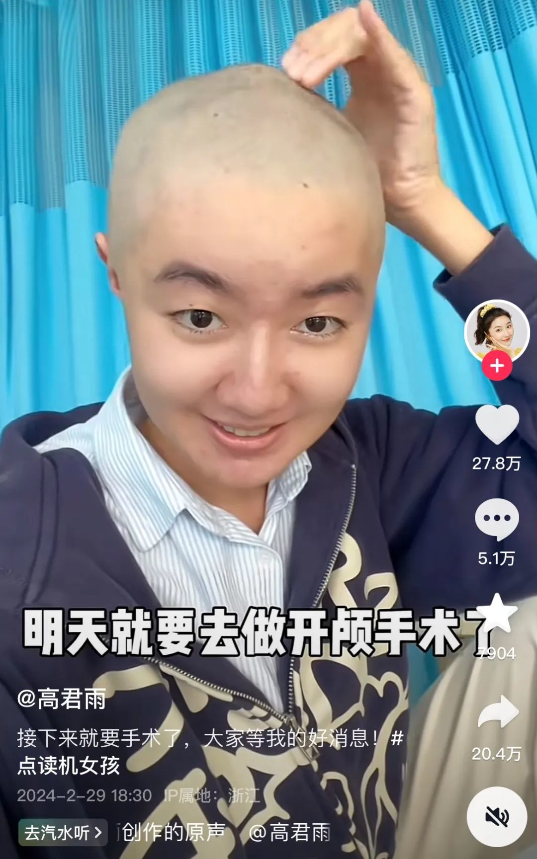 2月29日,高君雨账号发布视频称自己患上一种罕见脑瘤,并录下了用电动剃刀剃光头发的过程,视频背景疑似在医院病房,她微笑接受剃头,并配文: