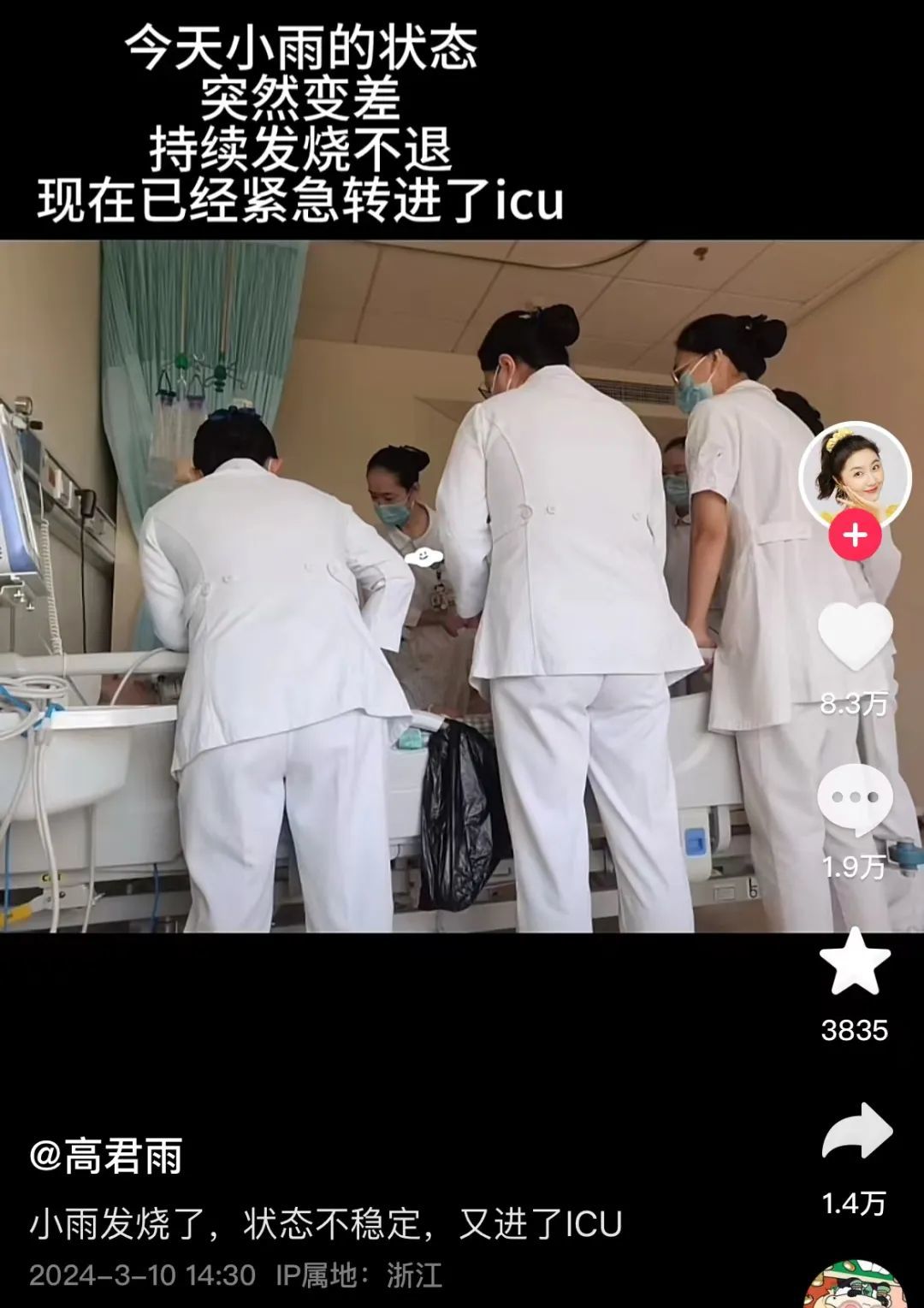 3月3日,高君雨账号发布视频称她进入了ICU,并让大家“不要担心”。
