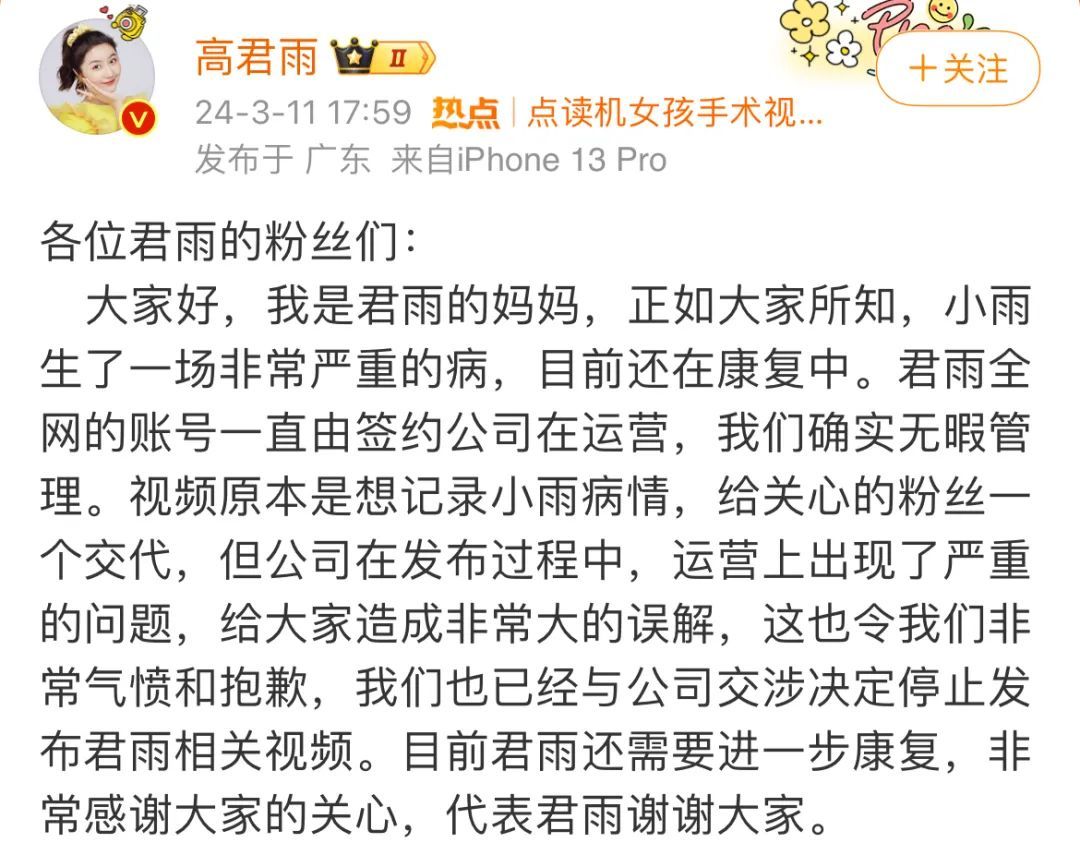 直到3月11日,高君雨的妈妈才发布了一条微博道歉,证实手术视频确实是“库存”: