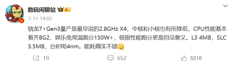 数码闲聊站在早些时候也已经透露了部分第三代骁龙 7+ 平台的配置信息,比如 2.8GHz 的 X4 超大核,安兔兔跑分就说可以超过 150W,具体是否真有这样的配置,就要看后续高通和终端厂商的正式介绍了。