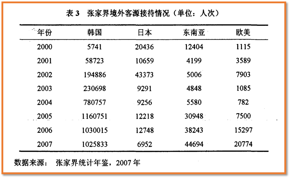 此后,张家界的韩国游客越来越多。2005年,116万人次来张家界旅游。这一年,韩国的出境游客人次是1008万,访华人数突破350万,首次成为中国第一大入境客源国。也就是说,每三个出国游玩的韩国人,就有一个来的是中国,每三个来中国玩的,就有一个去张家界。