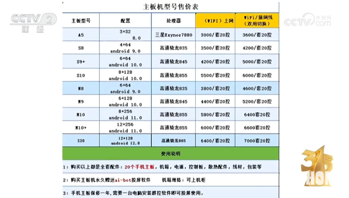 PChome发现,315晚会不光曝光了主板机黑灰产业链,并且还展示了主板机的配置和价格,主板机价位3000元-7000元不等,处理器包括三星猎户座7880、骁龙835、845、855等,并未看到华为海思处理器以及苹果A系列处理器打造的主板机。