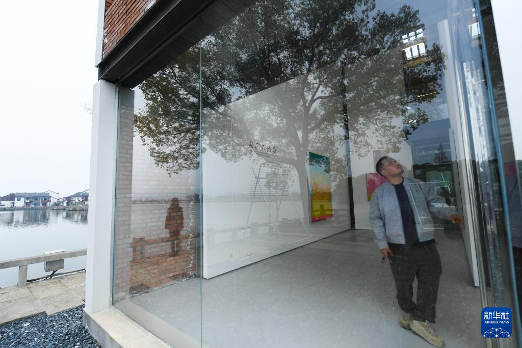 3月15日,一名男子在叶家堰居的画廊内观展。
