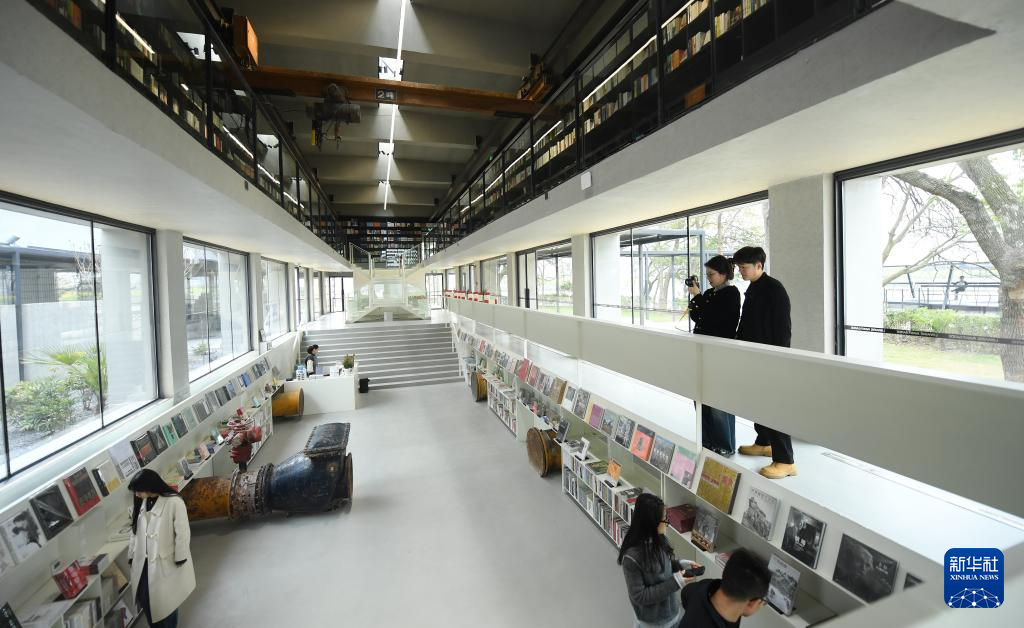 3月15日,游客在由自来水厂改造的先锋鉴湖书店参观。