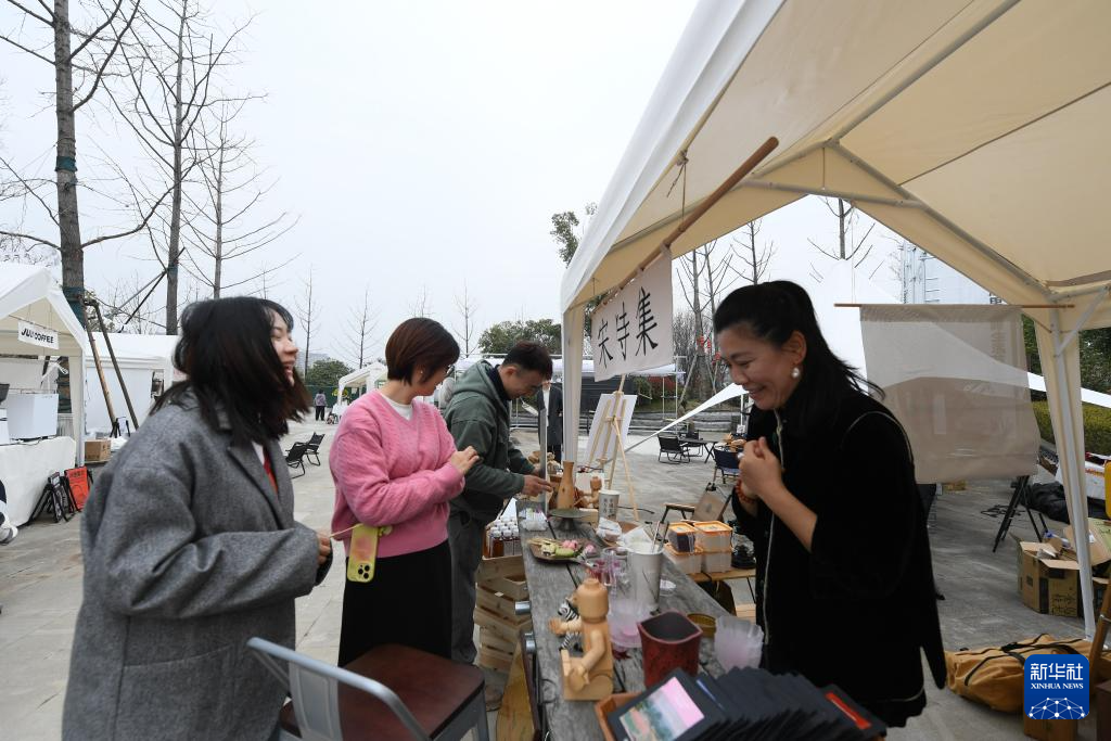 3月15日,年轻人在叶家堰居的一个市集上交流。
