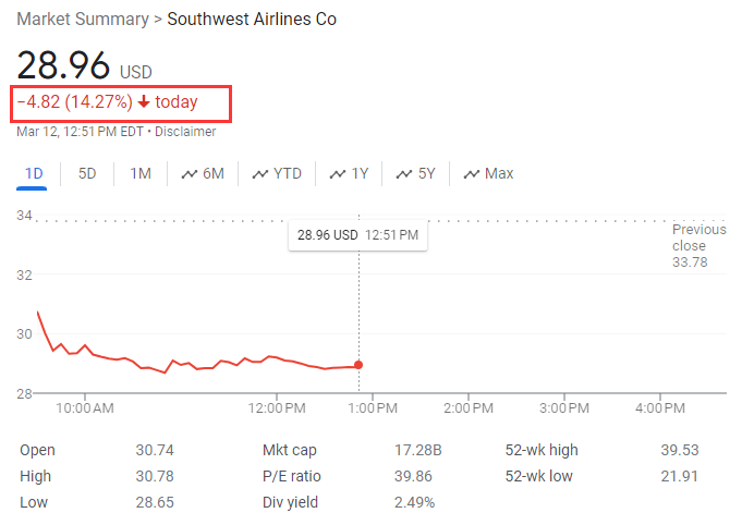 12日西南航空股价大跌,创2020年6月以来最大单日跌幅。
