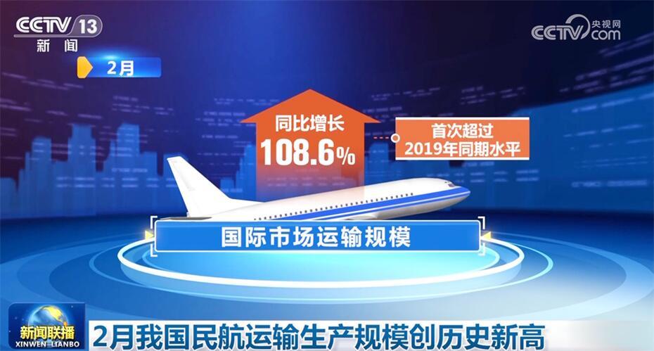 2024年民航运输生产开局良好。数据显示,2月,国内市场运输规模同比增长30.5%;国际市场运输规模同比增长108.6%,首次超过2019年同期水平,增速较1月提高12.1个百分点。