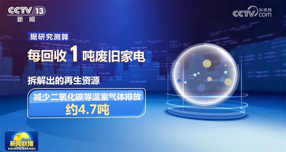 截至目前,我国冰箱、洗衣机、空调等家电保有量已超过30亿台。每年有1亿至1.2亿台废旧家电被淘汰。2023年,全国废旧家电回收总量达450万吨,而据研究测算,每回收1吨废旧家电,拆解出的再生资源能够减少二氧化碳等温室气体排放约4.7吨。随着国家今年新一轮以旧换新政策的启动,推动汽车、家电等产品的更新换代,预计将释放万亿元规模的市场空间。随着家电家具等耐用消费品制造循环利用产供销、上下游协同联动、综合施策,将有更多消费者和全社会从中受益。