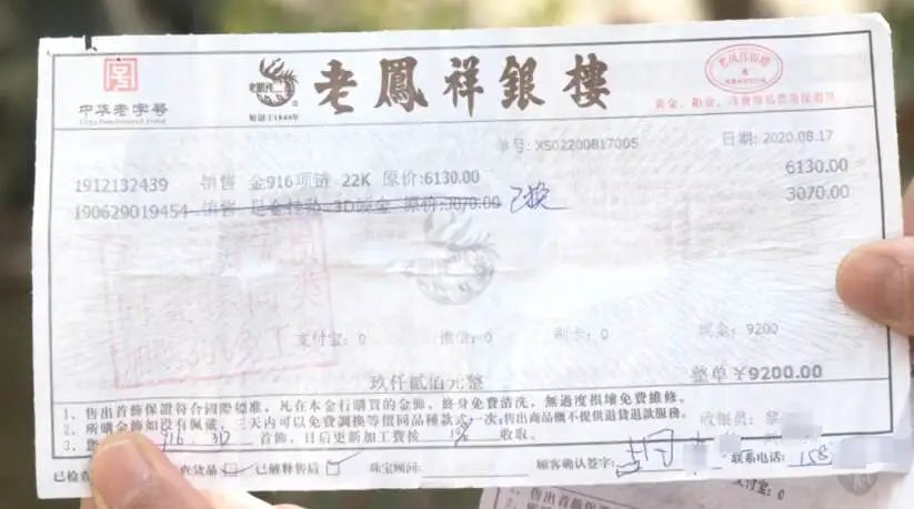 胡女士说,这条项链是她在“老凤祥”以旧换新来的。她说,自己之前在“老凤祥”买了一条19.5克的足金项链,戴了不久就断了。就在她打算维修这条项链时,看到老凤祥金店在搞活动。当时销售为胡女士推荐了一款金项链和金吊坠,现场计算了一下总价正好是9200元,而胡女士以旧换新的话,不用补差价,工费还免了。在这种情况下,胡女士就同意了置换。