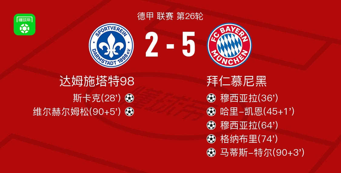 北京时间3月16日德甲 联赛 第26轮,达姆施塔特98主场对阵拜仁慕尼黑。达姆施塔特98斯卡克破门,维尔赫尔姆松破门。拜仁慕尼黑穆西亚拉梅开二度,哈里-凯恩破门,格纳布里破门,马蒂斯-特尔破门。最终比分达姆施塔特982-5拜仁。