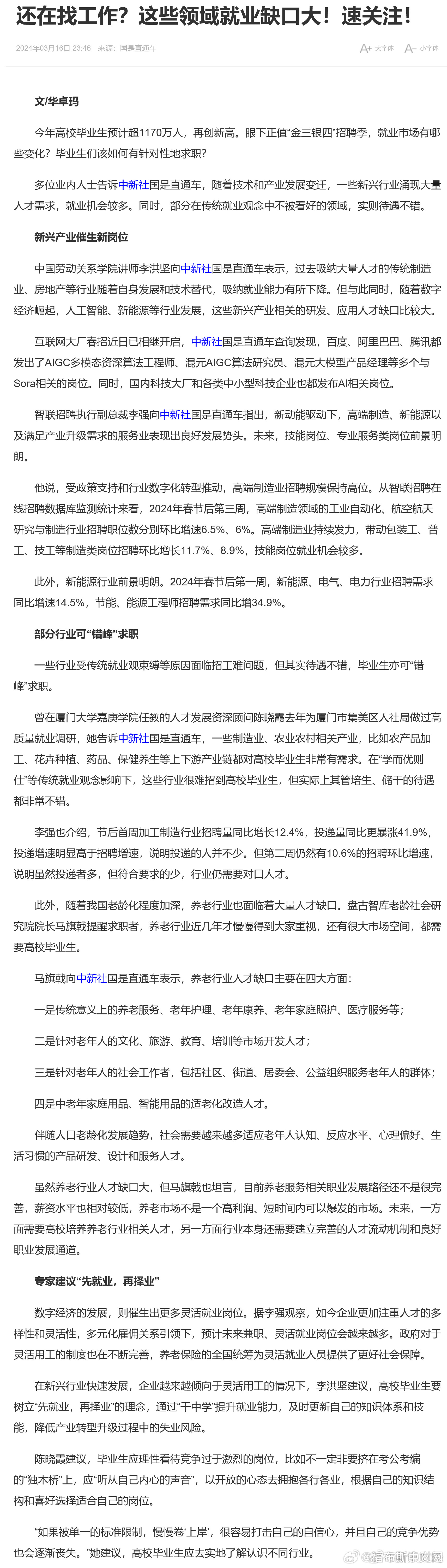 【#今年高校毕业生将超1170万人##专家建议先就业再择业#】今年高校毕业生预计超1170万人,再创新高。眼下正值“金三银四”招聘季,就业市场有哪些变化?毕业生们该如何有针对性地求职?