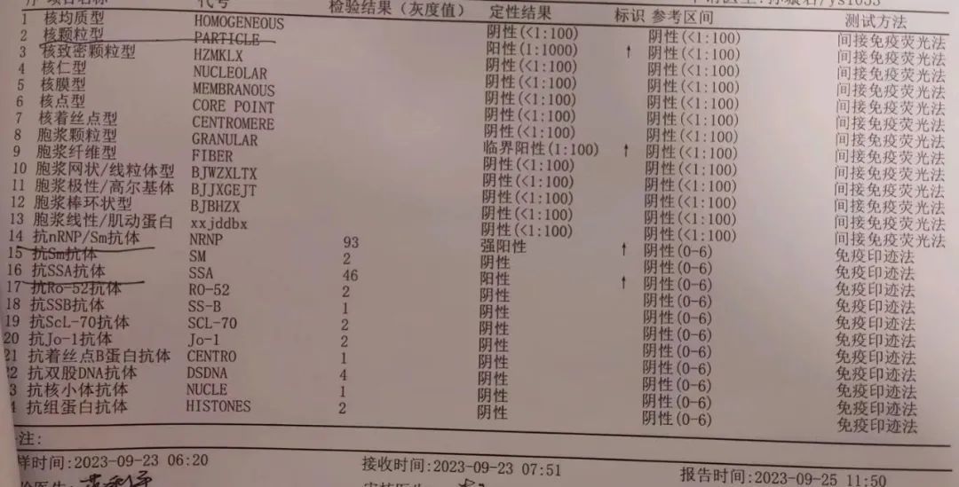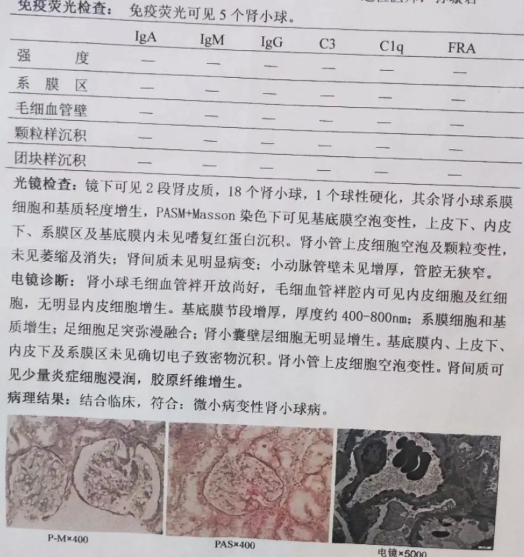 25号当天一项自身抗体检测出来,很多阳性。医生说现在还不能确定狼疮,还要看穿刺结果。过两天医生又说光镜下没什么异常,得看电镜,一开始说是糖尿病肾病,可是我明显血糖不高,又重新看了一次电镜,确诊微小病变,合并未分化结缔组织病。