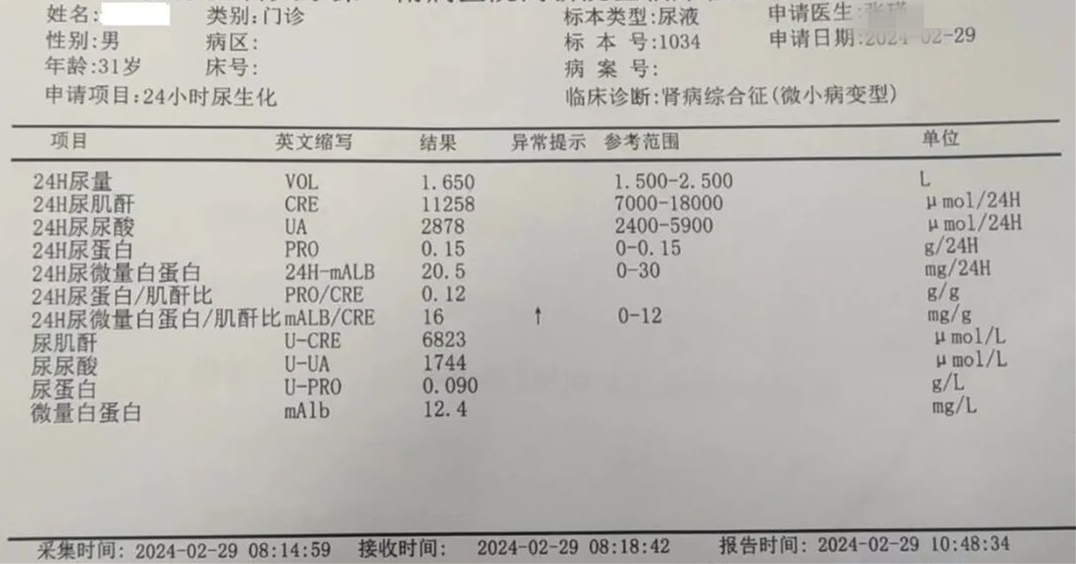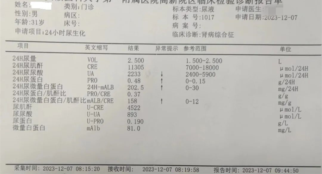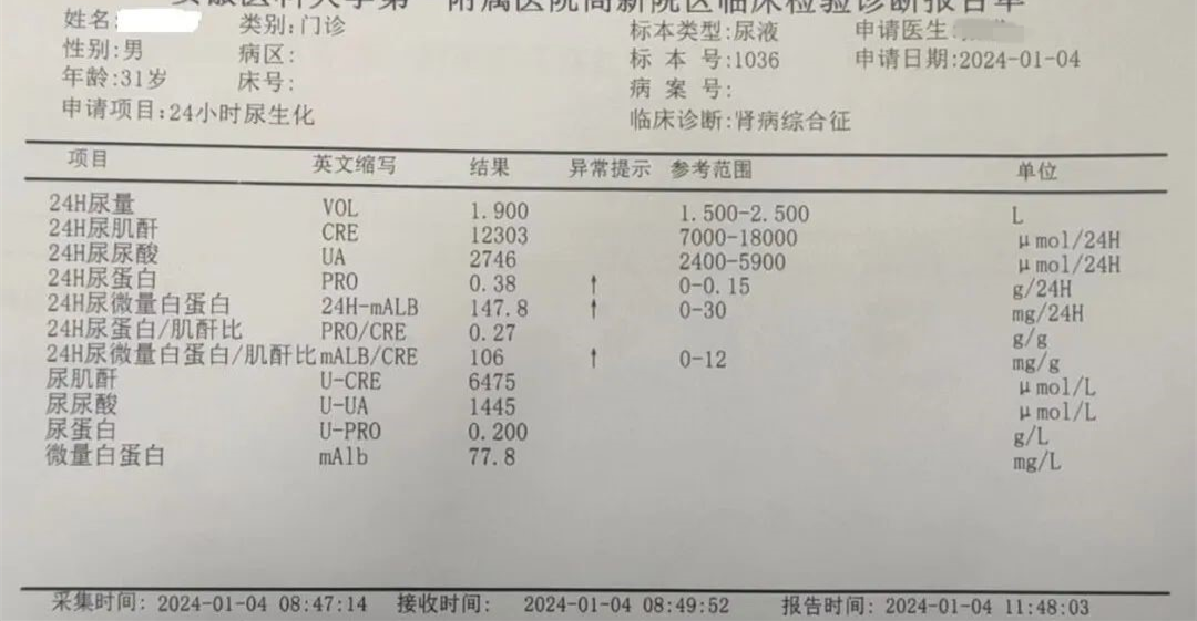 当检查结果一项一项出来,拿给医生看。年轻的女医生说话比较急:“你这是肾病综合征,要马上住院做穿刺检查,你这白蛋白只有30多,我担心过几天就掉到30以下。”边说她边开好住院单,让我赶紧去住院部。
