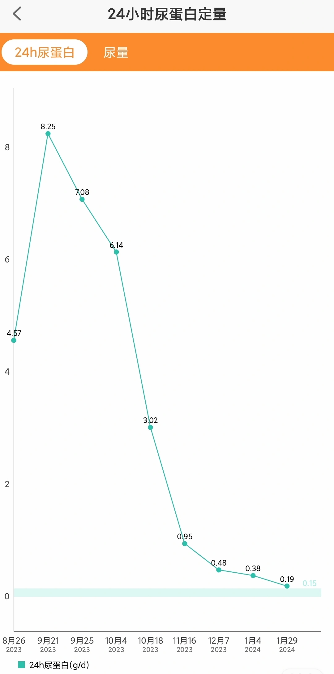 我在肾上线APP上记录的24小时尿蛋白定量变化▽