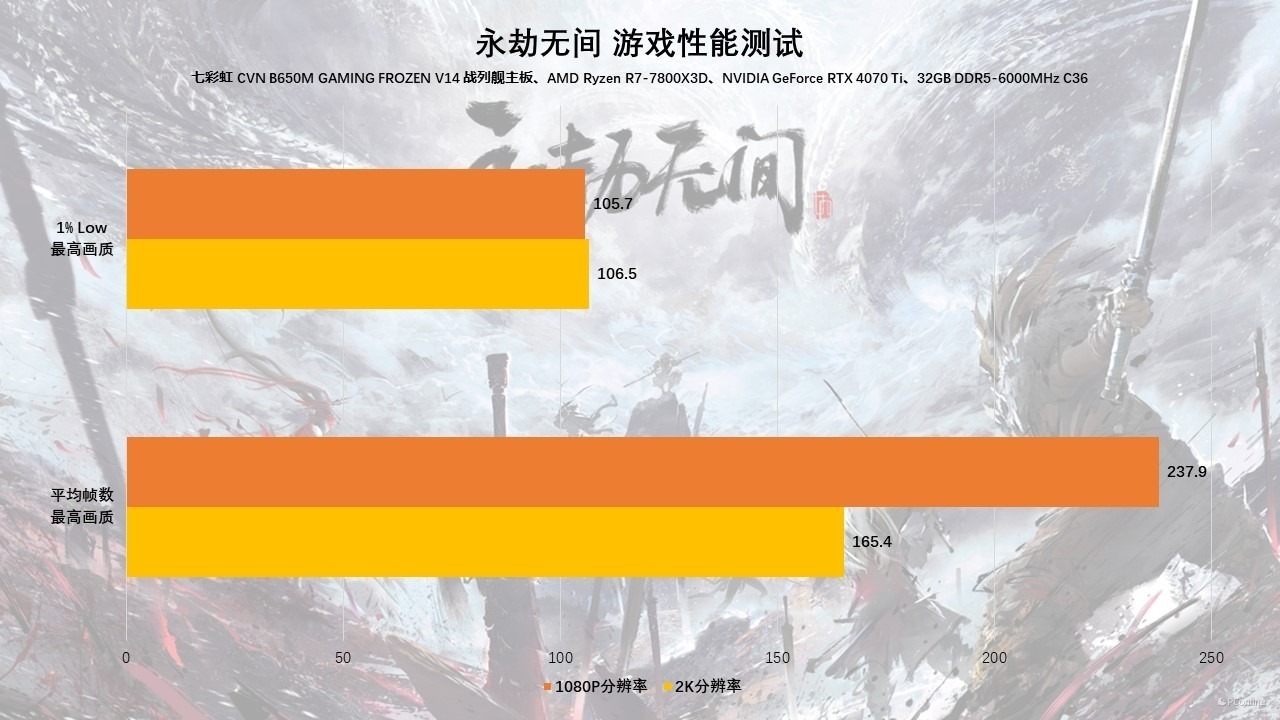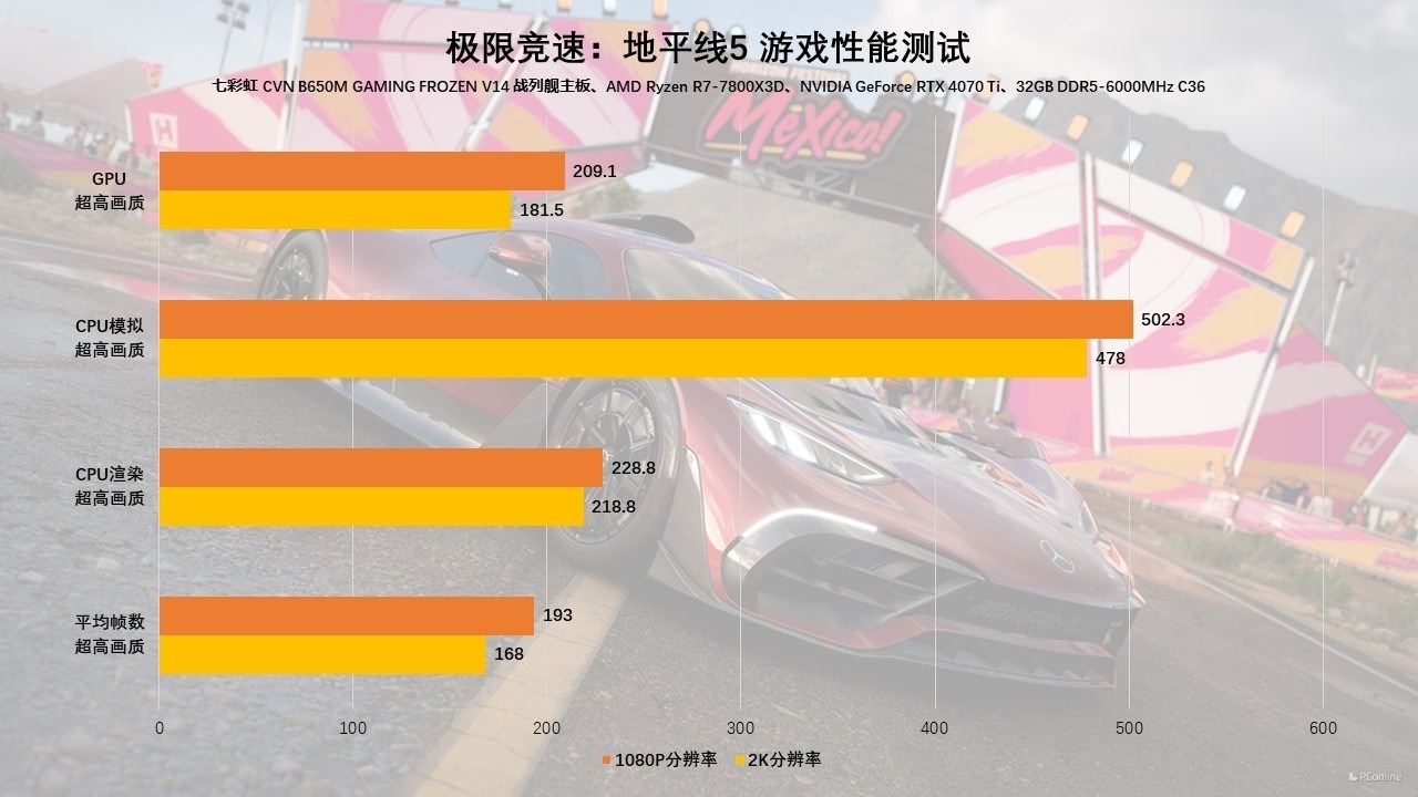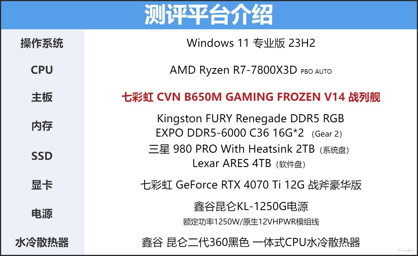 正式开始测试前,介绍一下我们的测试平台,为了测试七彩虹CVN B650M GAMING FROZEN V14主板的性能,CPU我们用的是有游戏神U之称的AMD Ryzen R7-7800X3D,BIOS中的PBO全设置为PBO AUTO,GPU显卡选用同款七彩虹的战斧 RTX 4070 Ti显卡,内存则是金士顿DDR5-6000 C36支持EXPO的内存条,其他配置方面基本上如下所示。